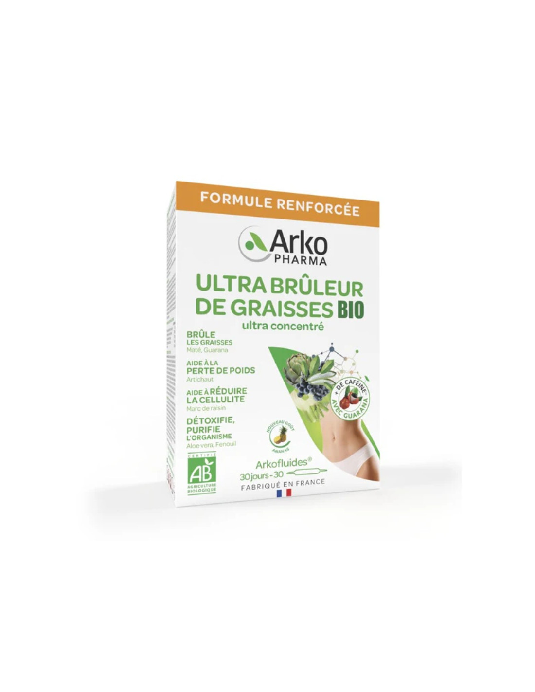 Arkofluides® Bio Ultra Brûleur de Graisses de Arkopharma est un complément alimentaire biologique destiné à accompagner la perte de poids dans le cadre d’un régime alimentaire équilibré et d’un mode de vie sain, en aidant à stimuler le métabolisme des graisses, à favoriser leur élimination et à soutenir les fonctions naturelles de détoxification de l’organisme grâce à une synergie d’extraits de plantes bio reconnues pour leurs actions minceur, tout en contribuant à une sensation de légèreté et au contrôle du poids.