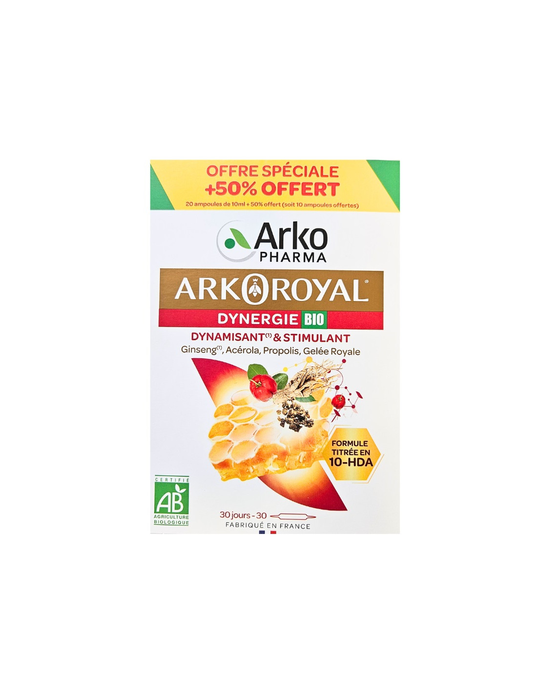 ArkoRoyal Dynergie est un complément alimentaire qui se présente sous forme d'ampoules, composées de Gelée Royale de qualité Premium dosée à 500mg, une substance sécrétée par les abeilles pour nourrir la reine de la ruche et lui procurer une longévité de vie 40 fois supérieure et une intense productivité.