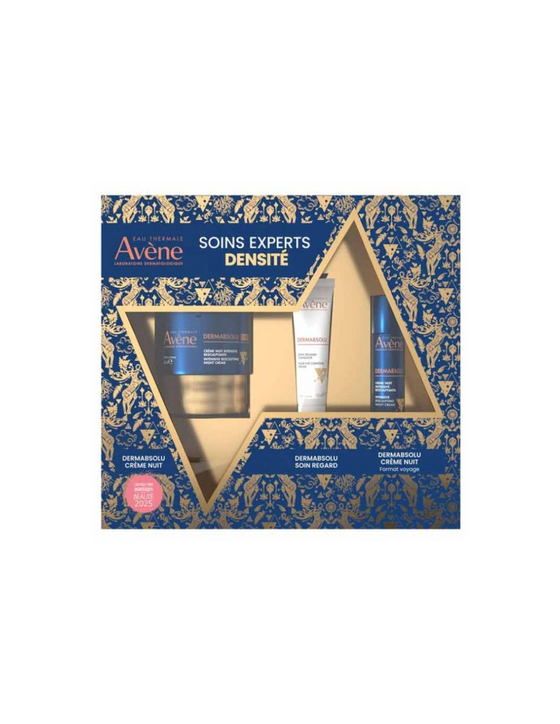 Le coffret Avène Dermabsolu associe la Crème Nuit Intensive Resculptante et le Soin Regard Combleur pour une action anti-âge complète. Ce duo agit durant la nuit pour raffermir, redensifier et nourrir la peau en profondeur tout en lissant le contour des yeux.