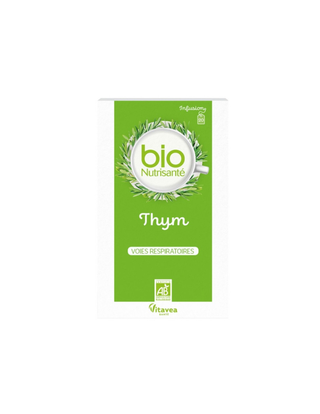 L’infusion BIO Nutrisanté Thym Voies respiratoires, une infusion en sachets au Thym qui participe au maintien de la fonction respiratoire et aide à apaiser les gorges irritées.