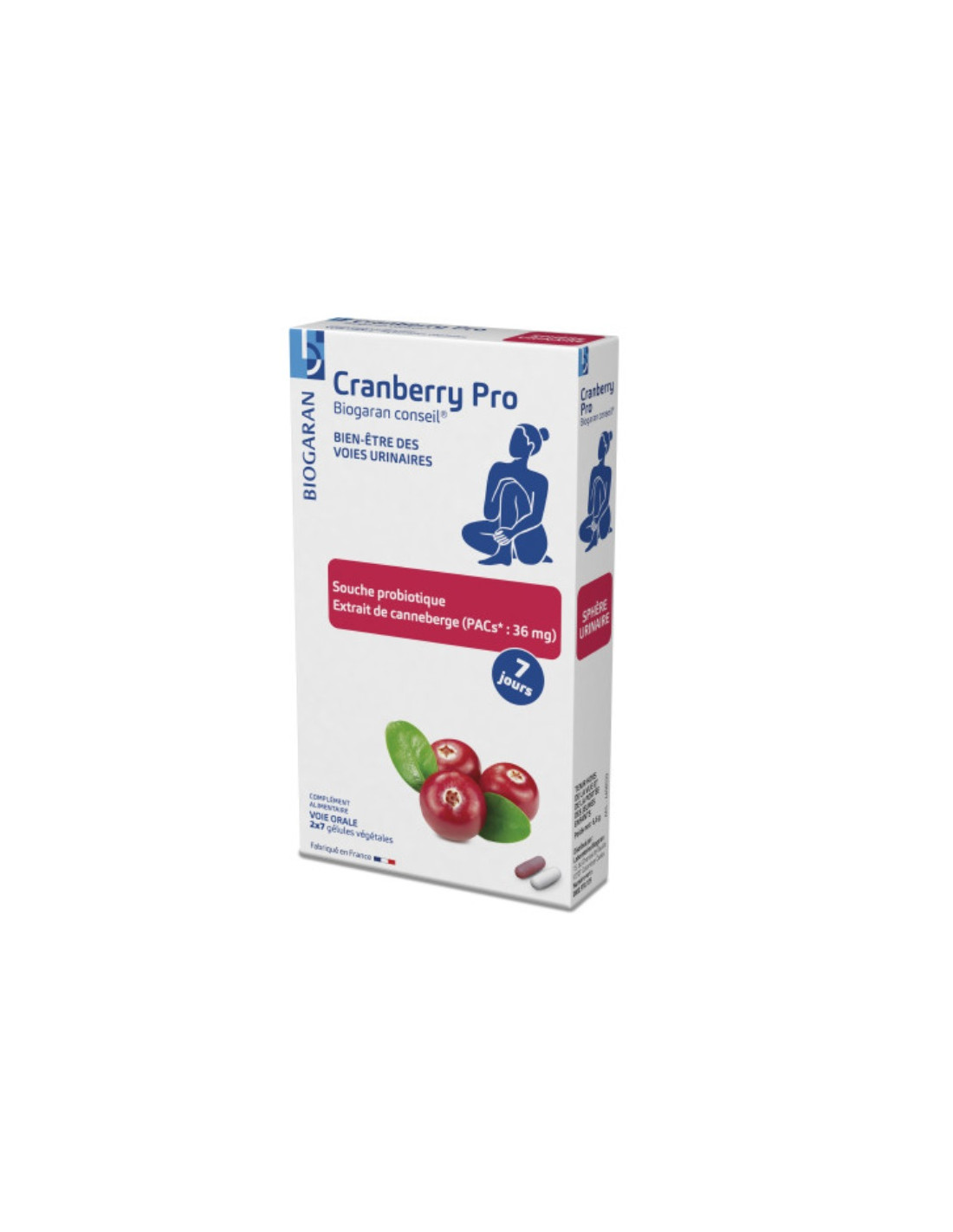 Cranberry Pro Biogaran Conseil est un complément alimentaire à base d'extrait de canneberge et d'une souche probiotique pour le bien-être des voies urinaires.