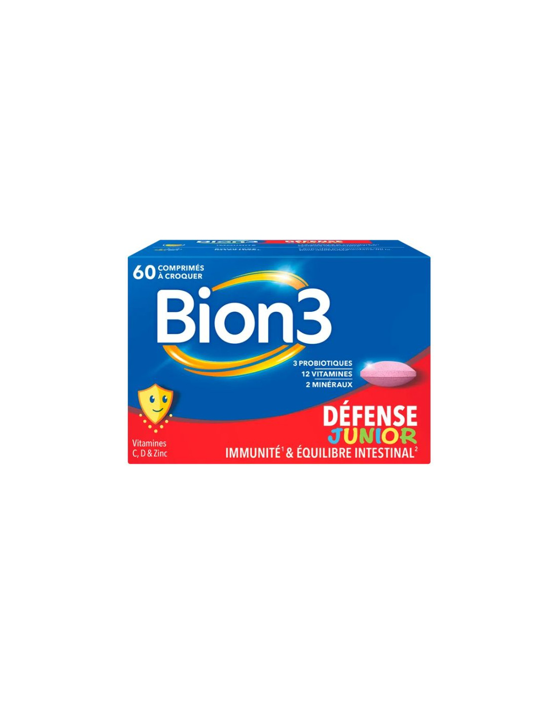 Bion 3 Défense Juniors est un complément sous forme de comprimés à croquer, composés d'une combinaison unique de 3 probiotiques (souches brevetées de Lactobacillus gasseri, Bifidobacterium bifidum et Bifidobacterium longum), de 12 vitamines et 2 minéraux dosés de manière optimale.