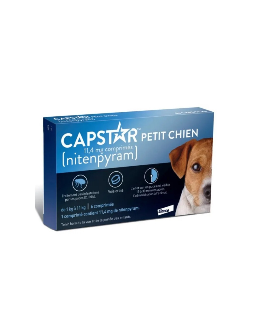 Le traitement anti-puces 11,4mg de nitenpyram CAPSTAR pour les petits chiens de ELANCO est un traitement d'attaque en cas d'infestation par les puces chez les petits chiens pesant entre 1kg à 11kg. Ce traitement permet d'éliminer les puces à partir de 15 à 30min après administration. Une seule administration suffit pour se débarrasser toutes les puces présentes sur les petits chiens.