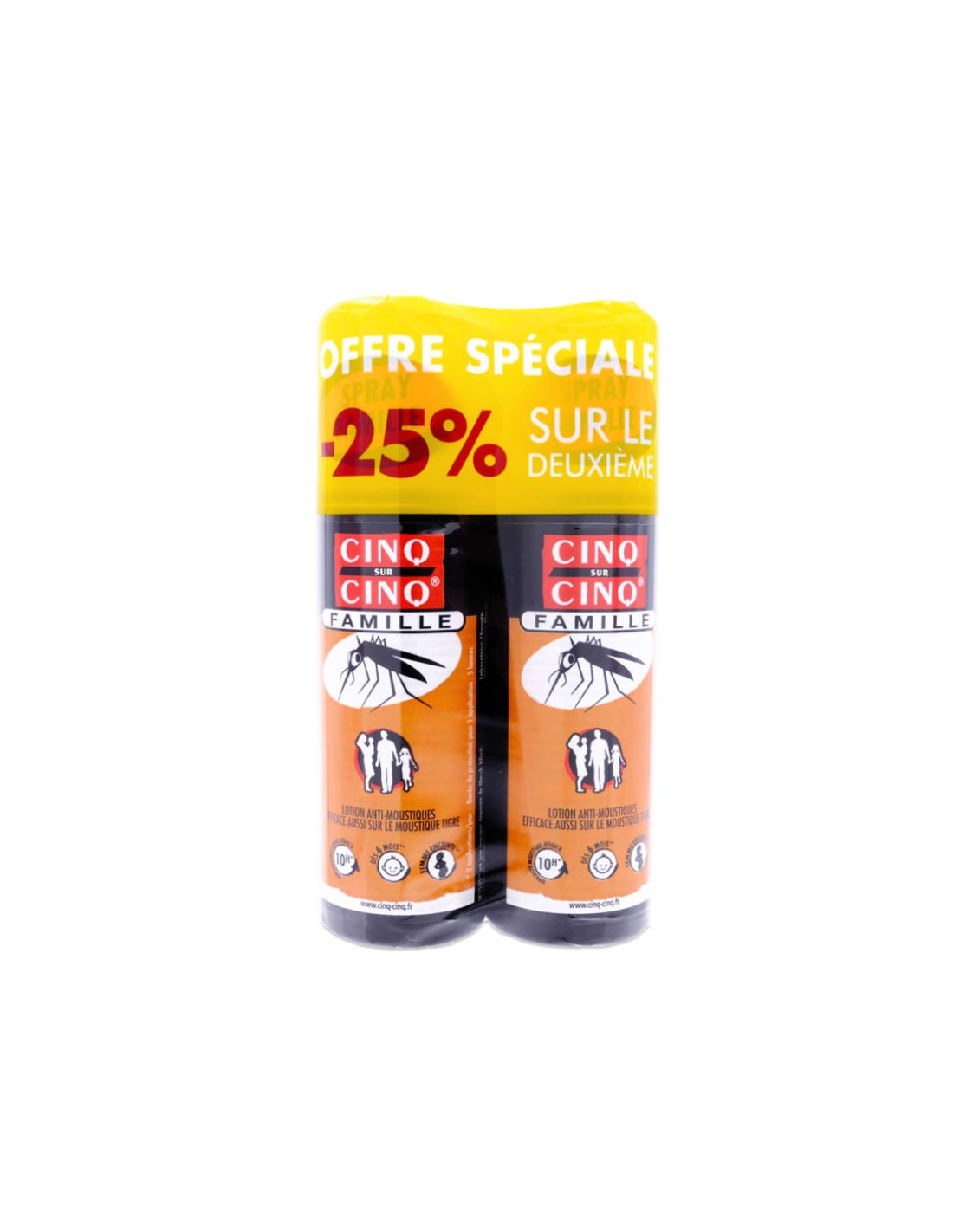 Le Spray Cinq sur Cinq® Famille, disponible en format 2x100 ml, est une lotion anti-moustiques spécialement conçue pour offrir une protection efficace et douce, adaptée aux personnes sensibles. Ce produit est particulièrement recommandé pour les femmes enceintes et les enfants à partir de 6 mois, lorsque d'autres moyens de prévention se sont révélés insuffisants ou inefficaces.