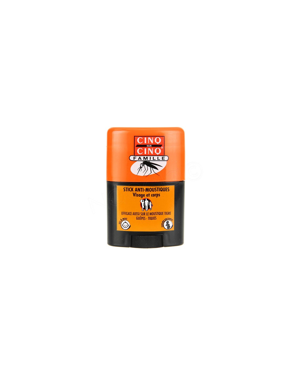 Le stick anti-moustiques famille cinq sur cinq est un répulsif indiqué pour protéger toute la famille (enfants dès 6 mois) contre les piqûres de moustiques (y compris le moustique tigre) les guêpes et les tiques durant la journée et lors des activités en plein air. Il convient à l'enfant dès 6 mois et aux femmes enceintes.Propriétés: