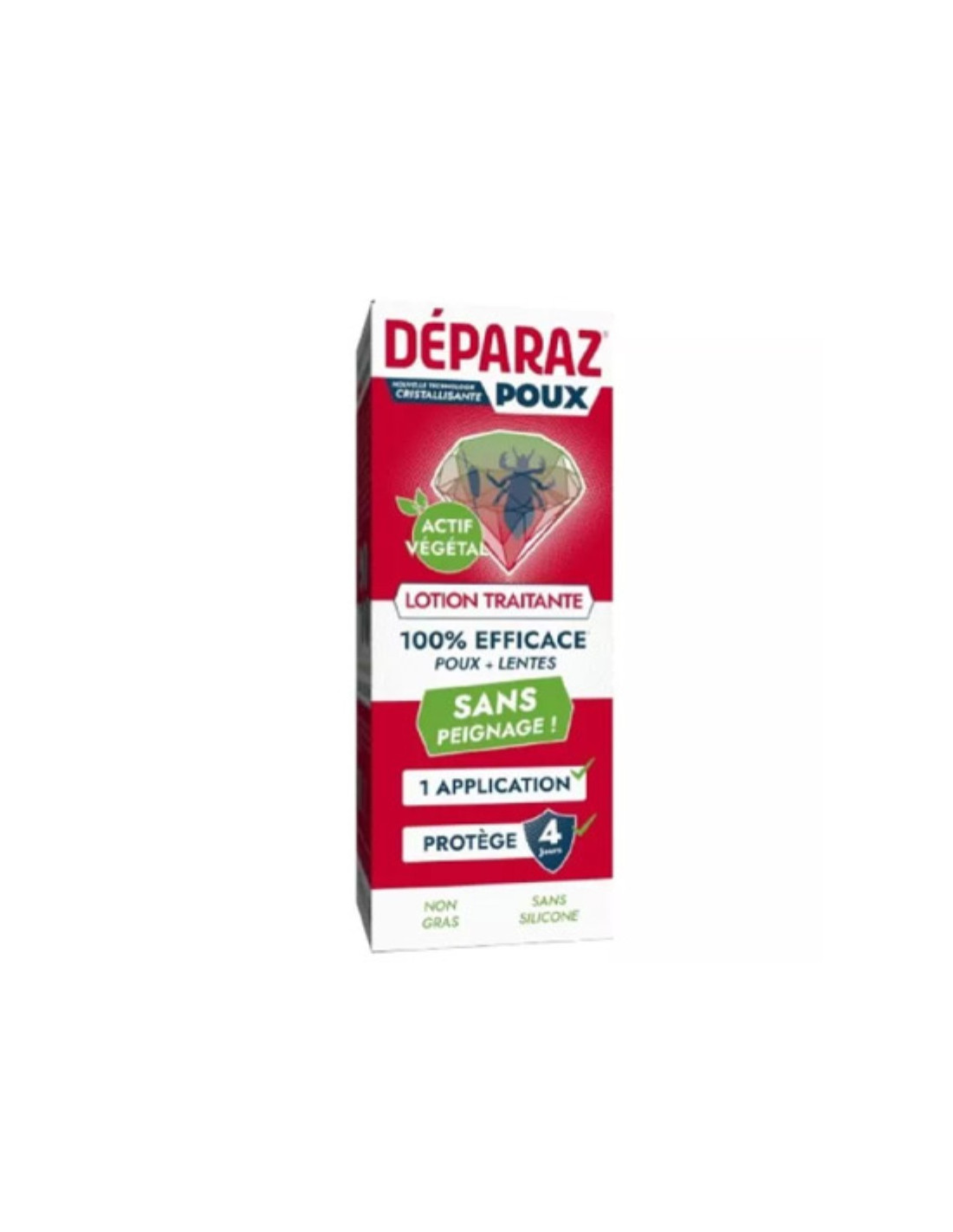 Déparaz-Pro® est une lotion anti-poux de nouvelle génération basée sur une résine extraite d’une plante ayant naturellement le pouvoir de piéger les insectes (effet cristal). Son efficacité a été démontrée dans une étude clinique menée chez l’homme. Non gras (sans silicone), la lotion est utilisable sur tous types de cheveux même les plus difficiles à coiffer (crépus, frisés, bouclés,…) car il ne nécessite pas de peignage après utilisation, ni de ré-application. Dès 1 an, convient à la femme enceinte ou allaitante.
