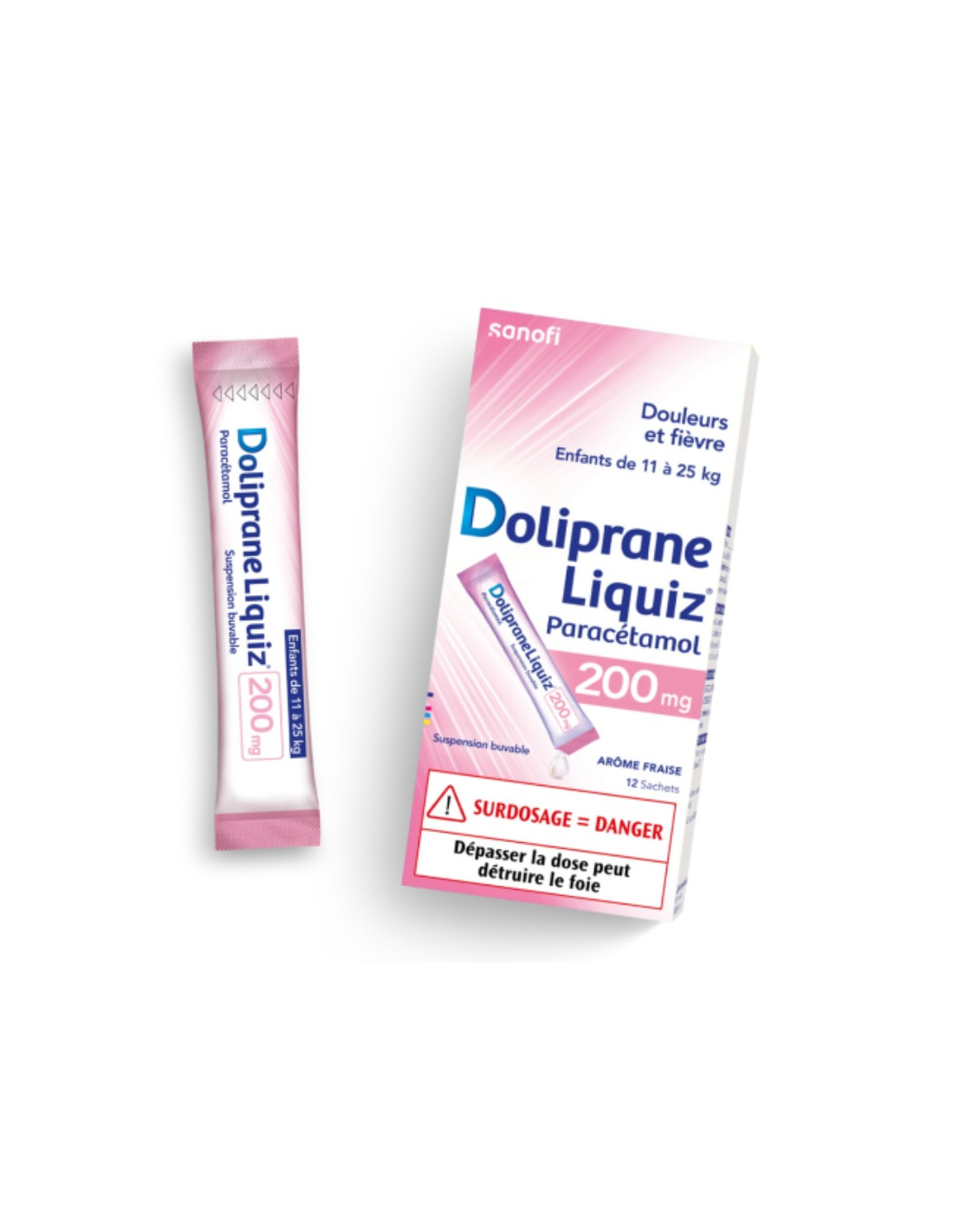 La présentation DolipraneLiquiz 200 mg sous forme de sachet stick rose pâle est réservée à l'enfant de 11 à 38 kg (soit environ 18 mois à 13 ans).