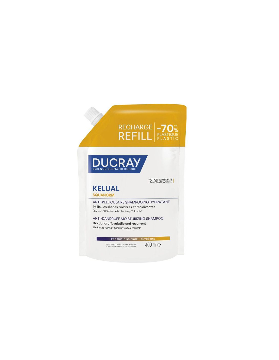 Le Shampooing Traitant Hydratant Kelual Squanorm de Ducray, en format éco-recharge 400 ml, élimine durablement les pellicules sèches tout en restaurant le confort du cuir chevelu.