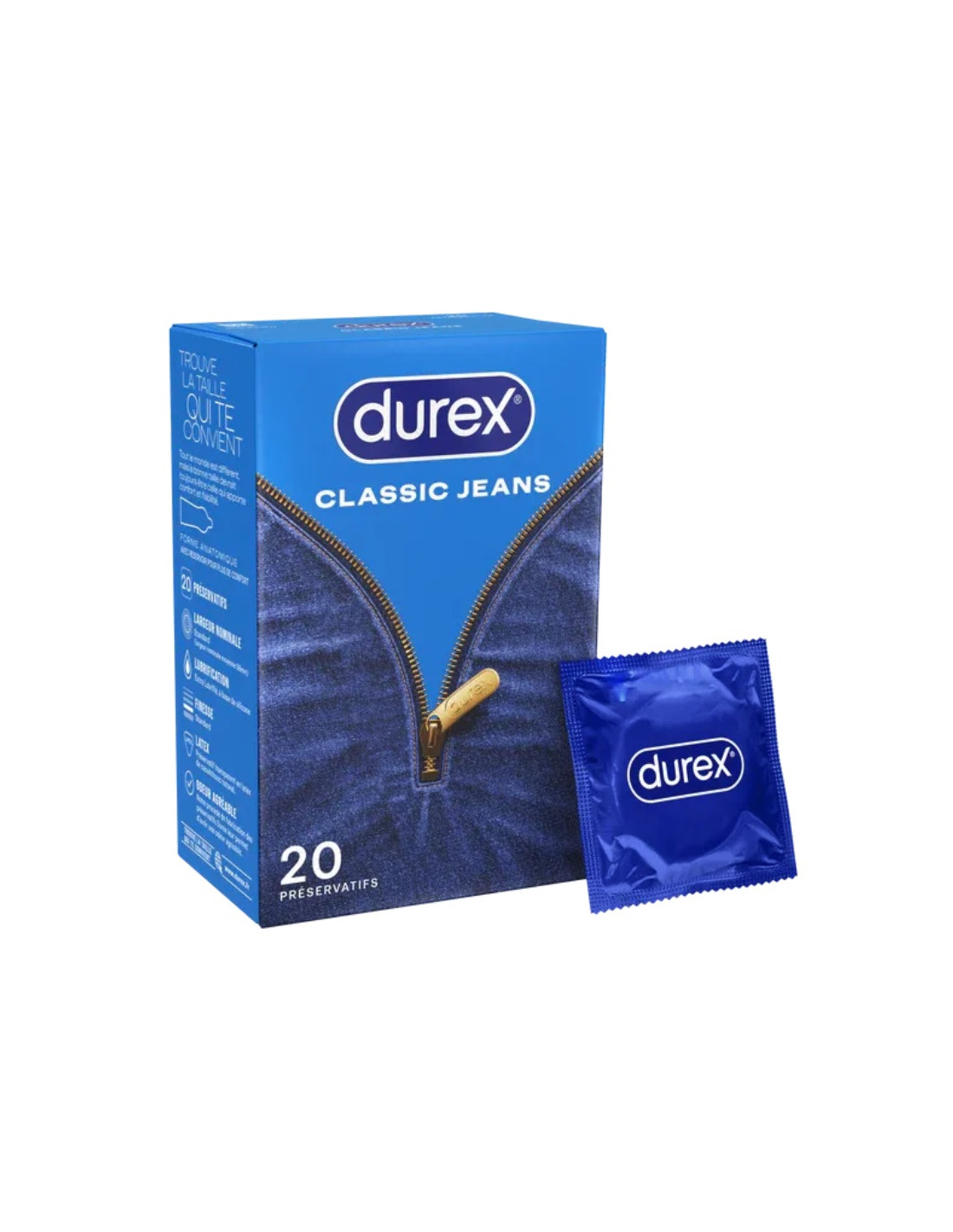 Les préservatifs Durex Classic Jeans sont transparents en latex de caoutchouc naturel. Ils sont extra lubrifiés avec un lubrifiant à base de silicone
