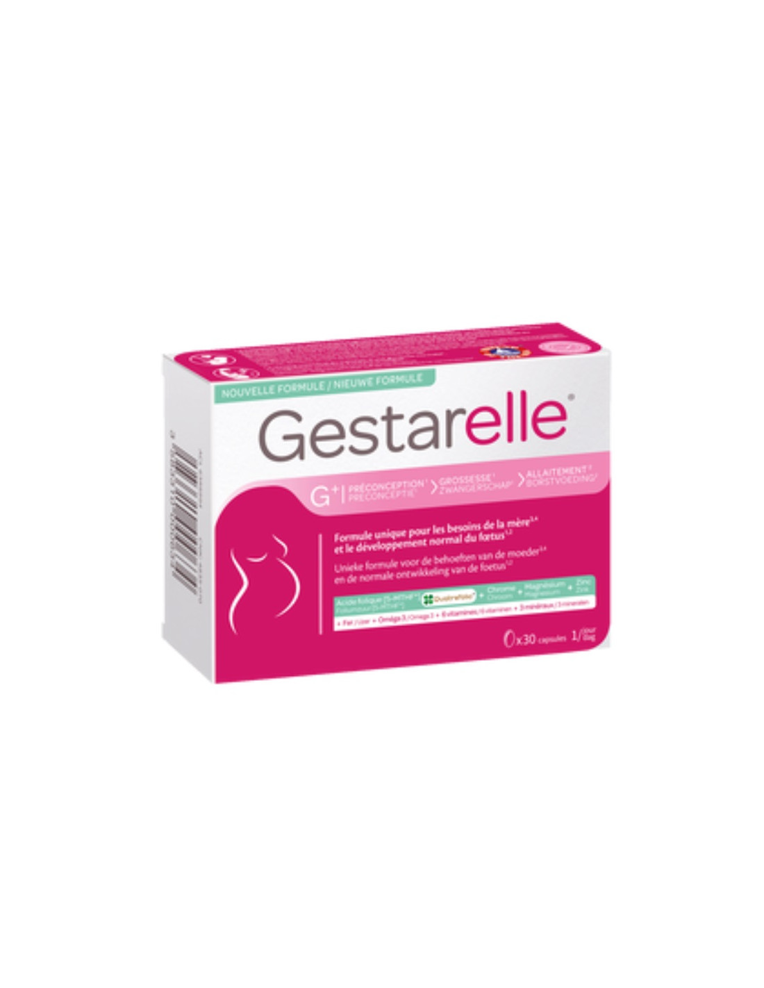 Gestarelle® G+ est conseillé dès le désir d’enfant et pendant toute la grossesse et l’allaitement. Il est conseillé de débuter Gestarelle® G+ dès la pré-conception afin d’apporter l’acide folique (Vitamine B9) quotidiennement recommandé pour contribuer à la croissance des tissus maternels lors de la grossesse(1). Avec une capsule par jour, Gestarelle® G+ apporte également de nombreux autres éléments indispensables comme les acides gras essentiels (Oméga 3 purifiés et stabilisés issus d’huile de poisson*), l’iode, le fer, les vitamines et oligoéléments dont les femmes ont besoin.