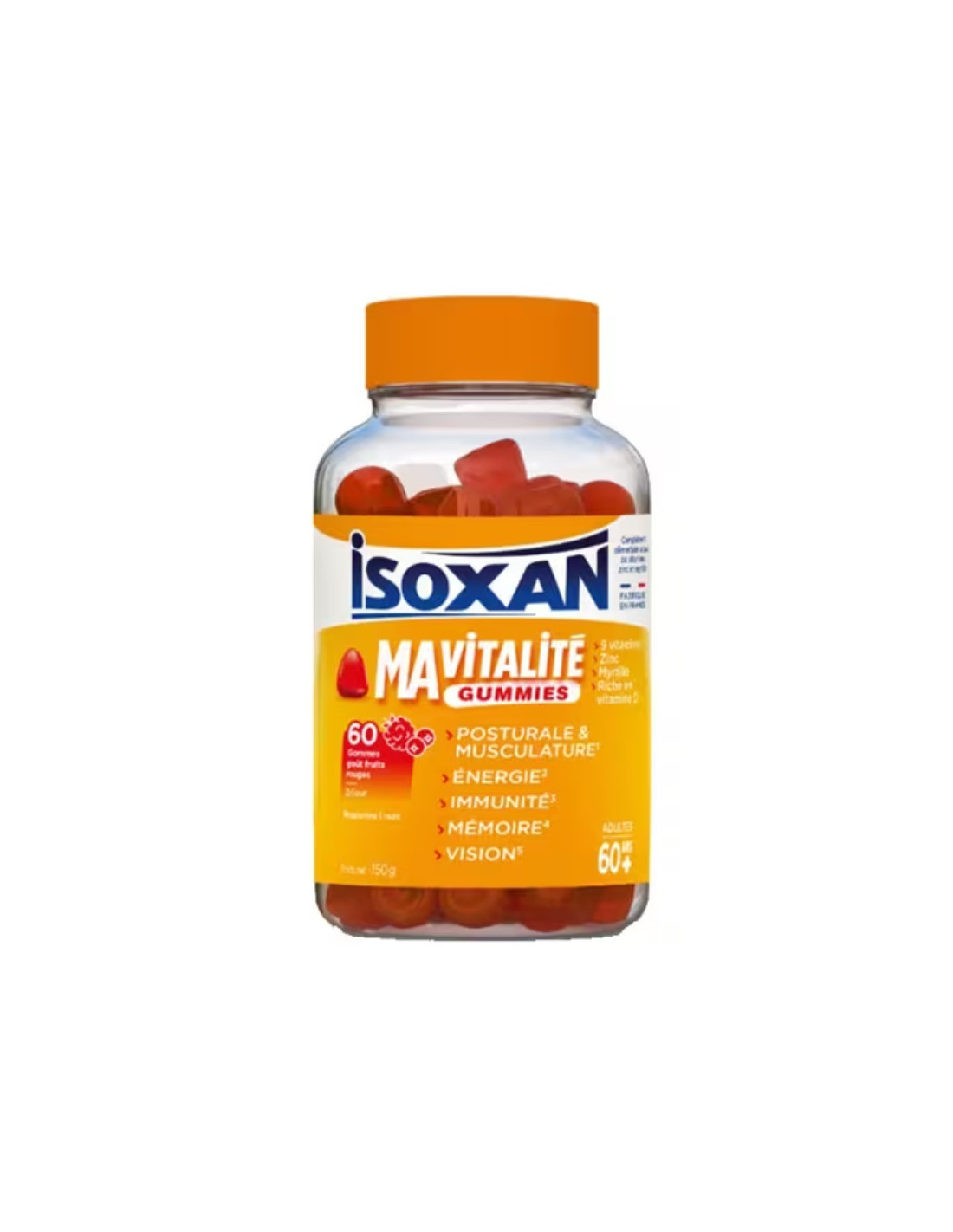 Isoxan MA Vitalité 60 ans + en gummies est un complément alimentaire fabriqué en France, et formulé à base de 9 vitamines, de zinc et de myrtille. Riche en vitamine D, il est recommandé pour soutenir l'énergie, l'immunité, la mémoire, la vision, le posture et la musculature :