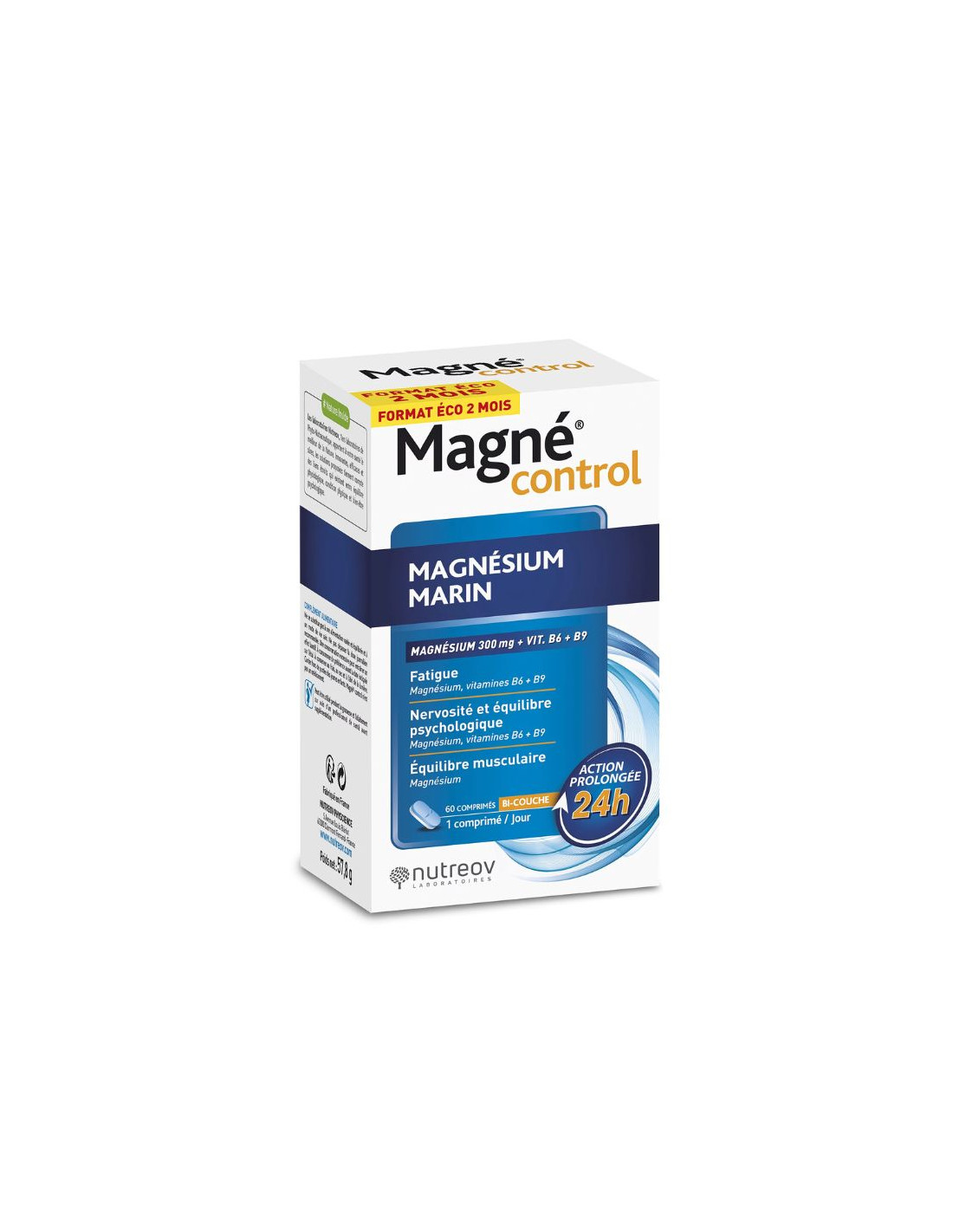 1 : Un magnésium marin d'origine marine, l'oxyde de magnésium de Magné Control est obtenu par concentration d'eau de mer et reconnu pour participer au bon fonctionnement neuromusculaire et à la bonne transmission de linflux nerveux.