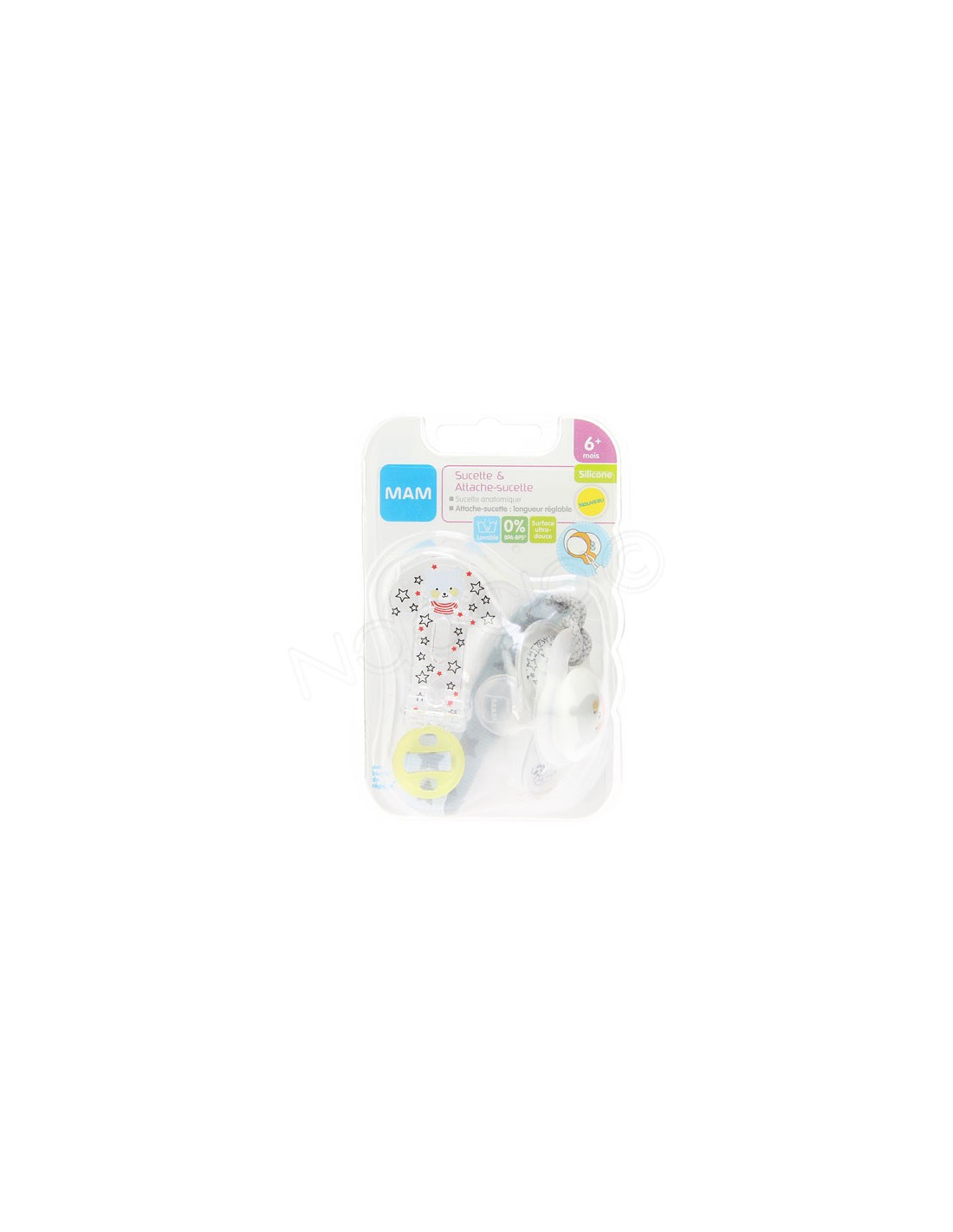 La sucette MAM possède une collerette douce pour un contact agréable avec la peau délicate de bébé, un bouton facile à attraper et permettant de fixer l'attache-sucette, et une tétine de forme symétrique pour se placer naturellement dans la bonne position et conçue en collaboration avec des dentistes. La tétine en silicone est très douce pour rappeler la peau : sa texture ultra-douce est brevetée.