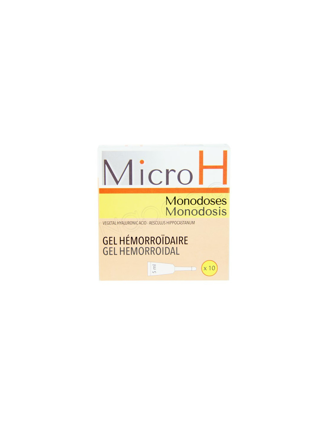 Le gel hémorroïdaire Micro H contient de l'acide hyaluronique végétal et autres substances végétales qui permettent de soulager les troubles hémorroïdaires. Ne contient pas de corticoïde ni de paraben. Cette boite contient 10 monodoses uniques et jetables après usage et permet 5 jours consécutifs de traitement.Conseils d'utilisation: