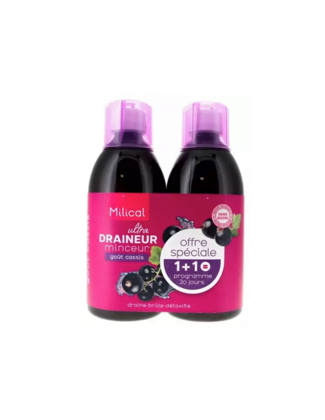 Milical Ultra Draineur Minceur Lot de 2 x 500 ml - Goût : Cassis est un complément alimentaire qui permet de drainer, éliminer et détoxifier votre organisme.