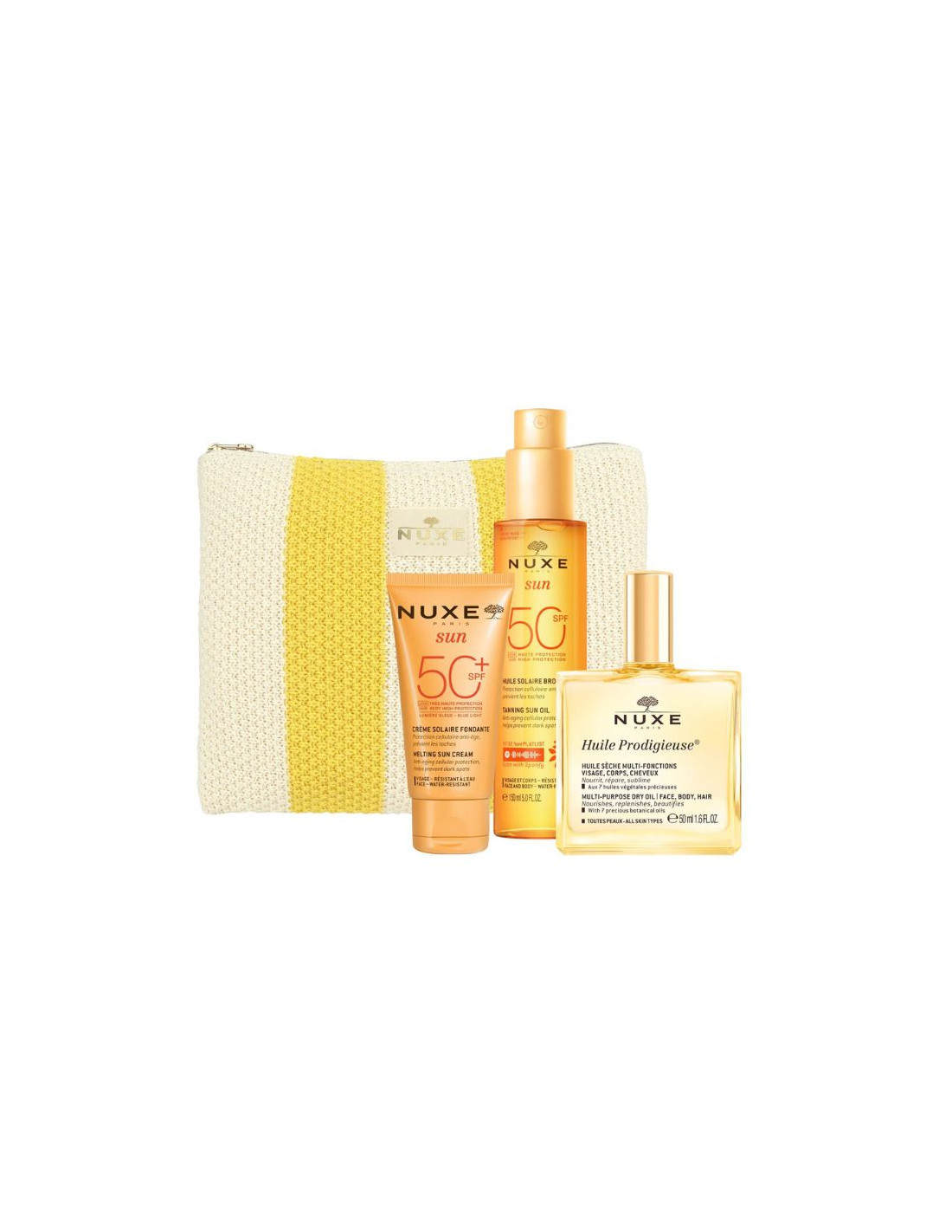 Laissez vous séduire par cette trousse solaire rayée jaune et beige qui réunit les 3 incontournables de l'été pour une peau protégée et sublimée.