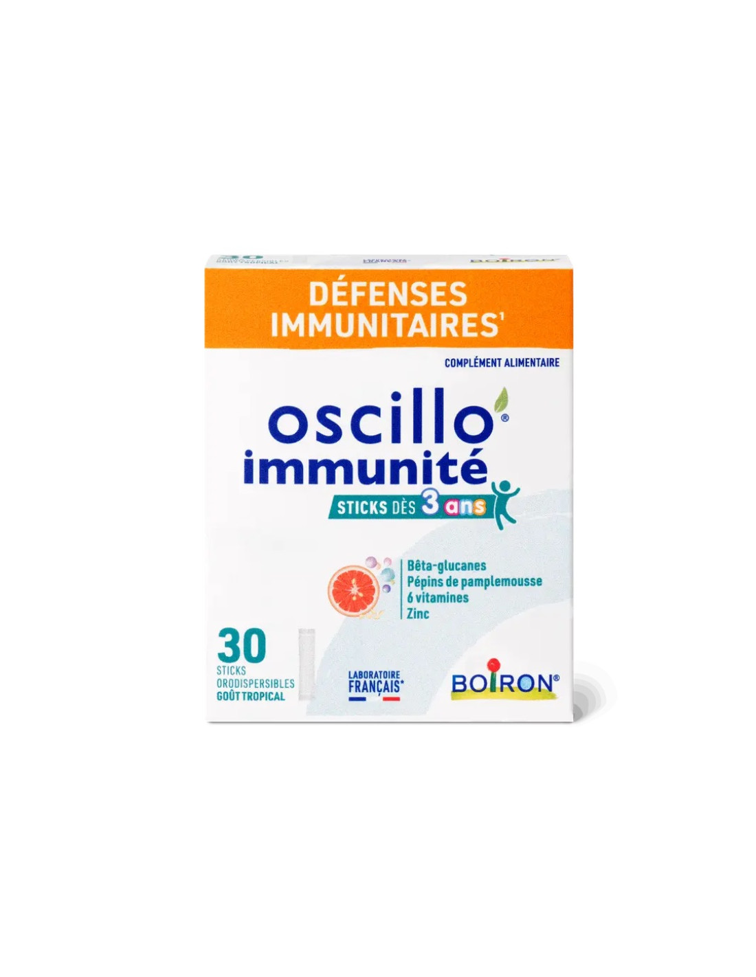 Oscillo’immunité dès 3 ans est un complément alimentaire à base d’extrait de pépins de Pamplemousse titré en flavonoïdes, Bêta-glucanes, Zinc, Vitamine D3, B6, B8, B9, B12 et C spécifiquement formulé pour les besoins du système immunitaire(1) des enfants dès 3 ans.