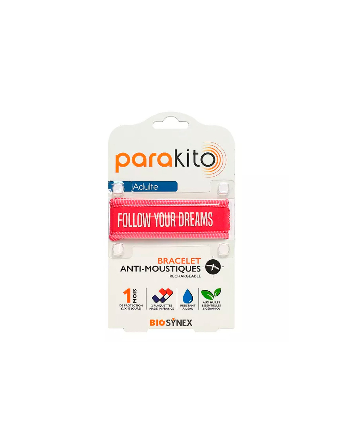Le Bracelet Anti-Moustique Rechargeable en taille adulte fuschia à message " FOLLOW YOUR DREAMS " de Parakito vous protège des moustiques en zones tropicales ou tempérées pendant une durée d'un mois ( 2 fois 15 jours ).