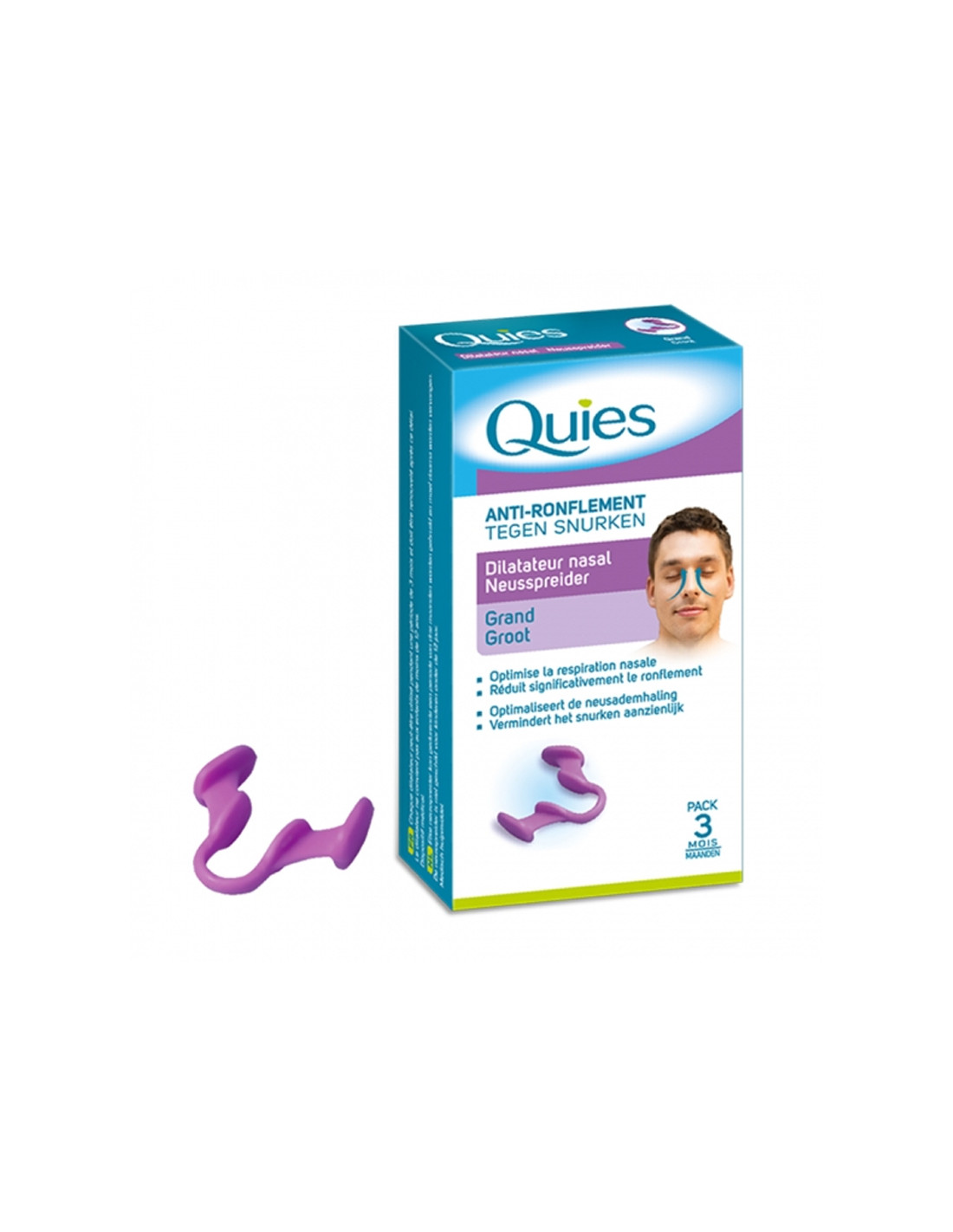 Le dilatateur nasal anti-ronflement Quies (appelé également écarteur nasal ou clip) procure immédiatement une sensation de plus ample respiration, diminuant ainsi le ronflement.