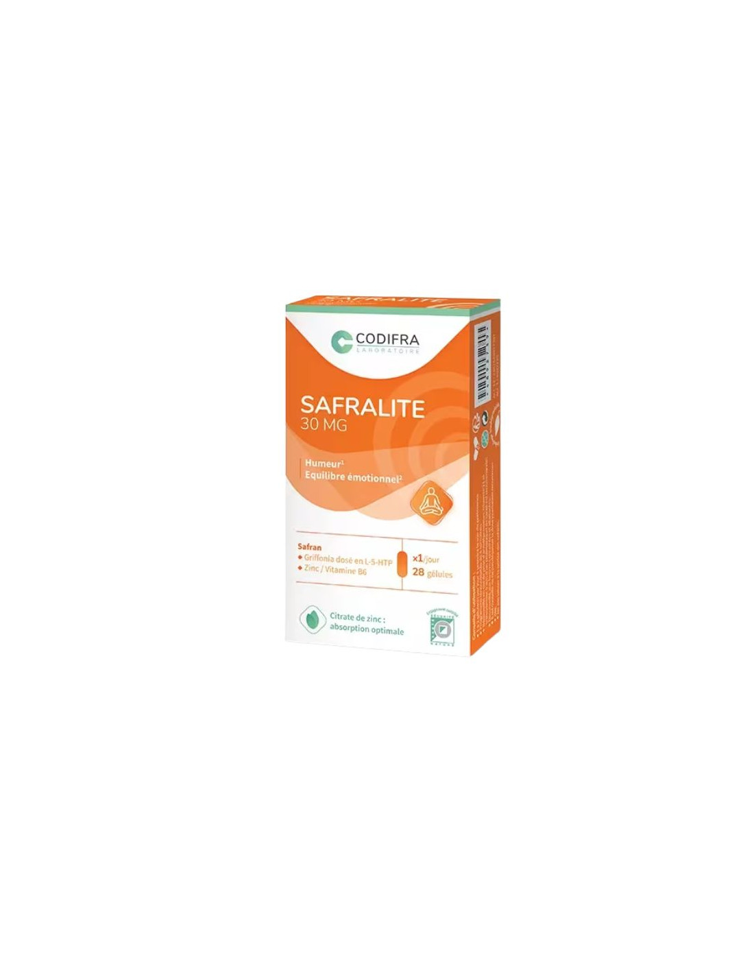 Safralite 30mg est un complément sous forme de gélules à avaler, composées de Safran, de vitamine B6, d'un extrait de Griffonia simplicifolia riche en L-5-HTP (reconnu pour ses effets contre la dépression et les troubles de l'humeur), et de Zinc (Hydroxy-Ri©) permettant de favoriser le calme et la relaxation, et de préserver une humeur positive.Ce produit respecte les critères du Label Santé Sécurité Nature©.