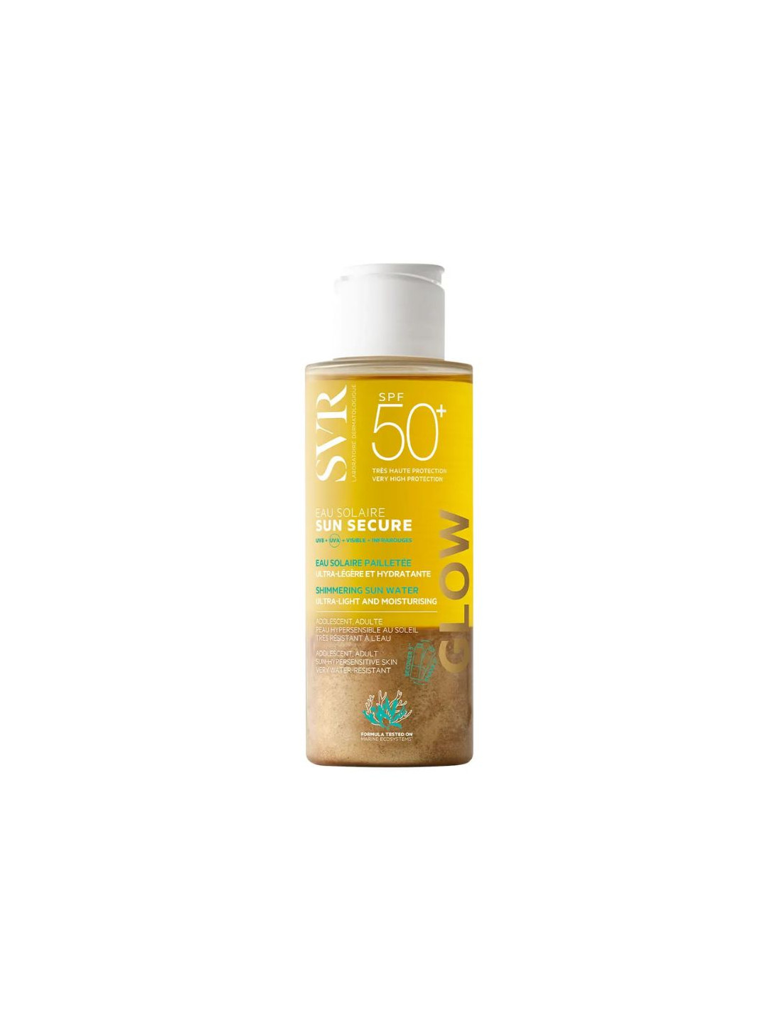 Svr Sun Secure Eau Solaire GLOW SPF50+ allie protection solaire haute performance et éclat immédiat pour une peau sublimée dès l'application. Cette version pailletée de l'iconique eau bi-phasée offre une très haute protection UVA/UVB, idéale pour les peaux sensibles exposées aux premiers rayons du soleil.