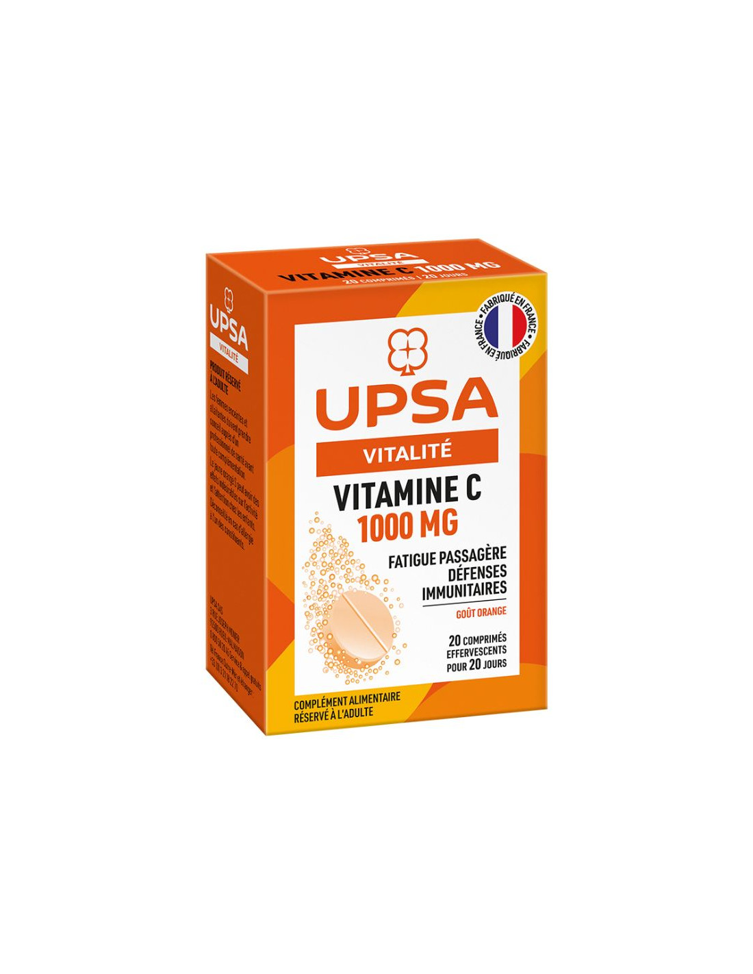 Le complément alimentaire UPSA Vitamine C comprimés effervescents est votre allié grâce à la vitamine C qui contribue à un métabolisme énergétique normal, à réduire la fatigue et qui est également reconnue pour contribuer au fonctionnement normal du système immunitaire. Réservé à l'adulte.