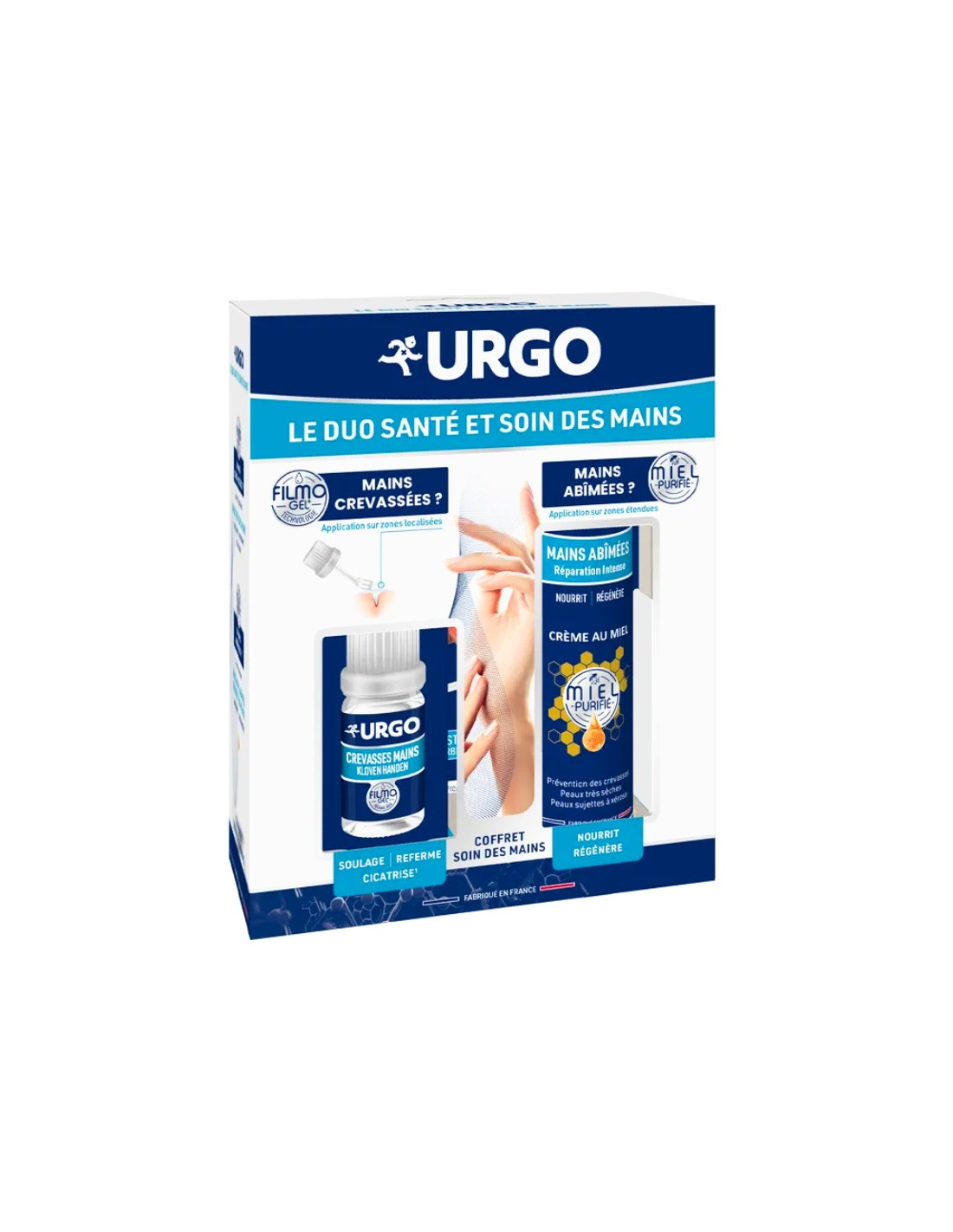 URGO Pack Duo Crevasses Hiver est une solution complète pour mains abîmées. Il associe Filmogel Crevasses Mains, qui protège et soulage les fissures, à une crème au miel nourrissante pour prévenir la xérose. Ce duo répare, protège et prévient les crevasses liées au froid, pour des mains douces tout l’hiver.