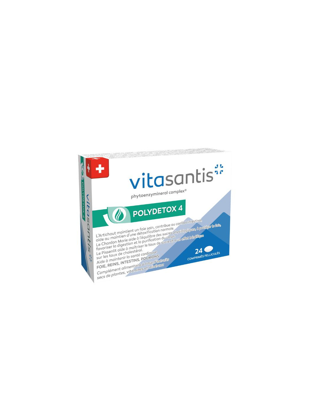 Vitasantis® Polydetox 4 est un mélange d’Extraits Secs, de Vitamines et d’Oligo-éléments. Il convient notamment pour : Troubles digestifs, Excès alimentaires, Nettoyage de l'organisme, Foie fatigué, Fêtes : Excès alimentaires, nausées, digestion difficile, Excès alcool, « gueule de bois », Constipation, Aérophagie, ballonnements.