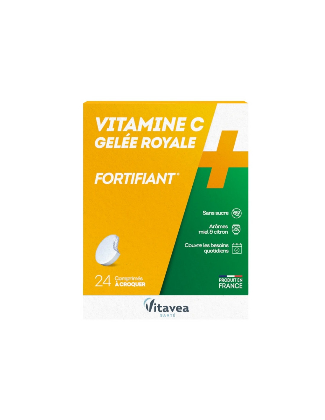 Vitavea Vitamine C + Gelée Royale Fortifiant 24 Comprimés à Croquer est un complément alimentaire sous forme de comprimés à croquer à base de vitamine C et de gelée royale lyophilisée, avec édulcorants d'origine végétale.